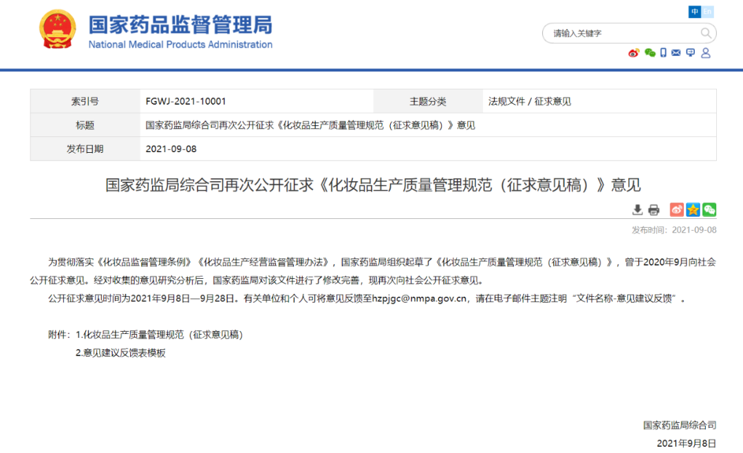 一份文件两次公开征求意见,尚属行业。由此可见,业内及监管层对《化妆品生产质量管理规范》的重视。据悉,该法规自2022年1月1日起施行。
