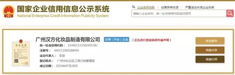 行政处罚决定书(穗云市监处字[2021]898号)显示,2021年6月1日,根据举报,广州市白云区市场监督管理局对当事人广州汉方化妆品制造有限公司涉嫌广告违法行为依法立案调查。