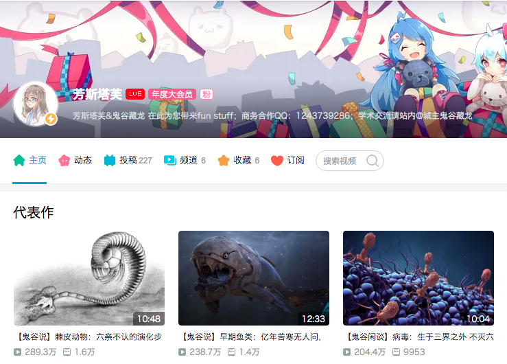专业古生物科普UP主,与搭档鬼谷藏龙一起,从科学角度解读古生物知识。一个就职于专业学术期刊,另一个则是中科院博士。其视频内容专业,但在风格调性上又幽默有趣不枯燥,易于接受和理解,能够让孩子轻松快乐地学习科学知识。