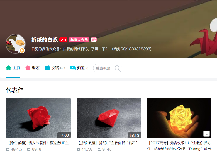 第3位手工技艺类:折纸的白叔(粉丝69.3W)