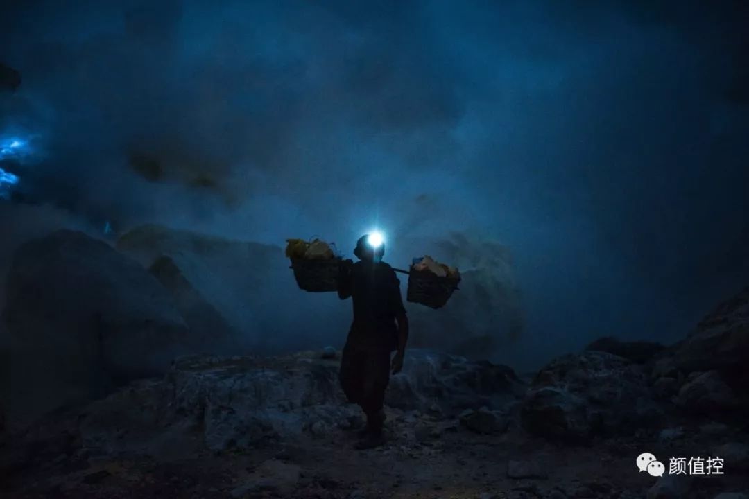 在黎明之前,一位硫磺矿工在爪哇东部的Kawah Ijen陨石坑中将他的负载带过天然气。熔融的硫磺燃烧着蓝色的火焰,在夜晚给有毒气体带来令人毛骨悚然的色彩。