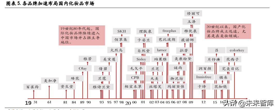 国内化妆品行业发展 70 余年,品牌持续布局,为市场不断注入新鲜血液。国内化妆品市场经历四大 阶段:1950-1970 年:只有雪花膏、凡士林等,本土市场缓慢发展;1980-1990 年:随着改革开放,夏 士莲、旁氏等品牌入驻中国,逐步垄断国内市场,国内品牌在该阶段主要跟随模仿;2000-2016 年: 本土品牌开始发展,2008 年后借助互联网崛起,根据消费者需求进行品类及渠道等创新,进入上升 发展期;2016 年-至今:随着移动互联网、4G 普及,伴随互联网成长的 Z 世代消费者逐步成为消费主 流人群,国货时代来临,与国际竞争。