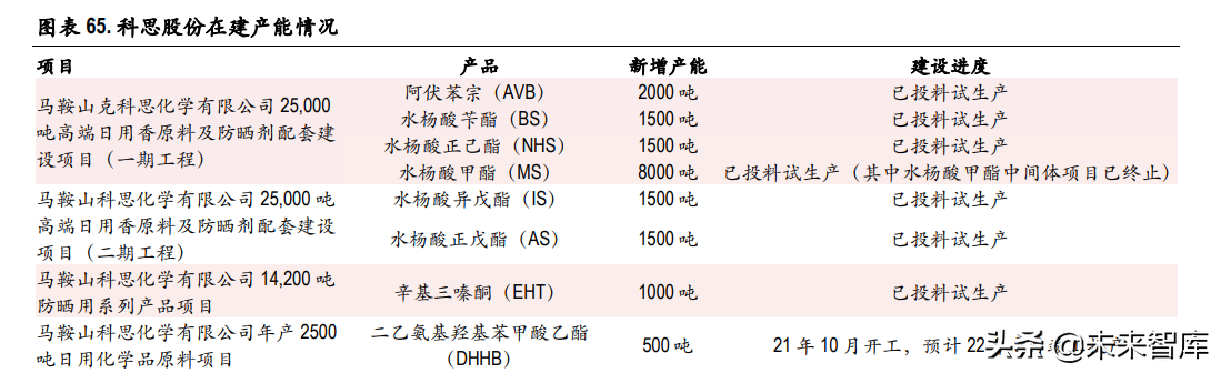 业务布局与客户结构:公司业务主要涉及防晒剂和合成香料,其中,防晒剂等化妆品活性成分主要 客户包括帝斯曼、拜尔斯道夫、宝洁、欧莱雅、默 克、强生等大型跨国化妆品公司和专用化学品公 司;合成香料主要客户包括奇华顿、芬美意、IFF、德之馨、高砂、曼氏、 高露洁等知名香料香 精公司和口腔护理品公司。帝斯曼为公司第一大客户,2020 年收入占比达 43.3%,两者合作于 2015 年 开始,2017 年 7 月帝斯曼宣布与科思股份建立了战略合作伙伴关系,与大客户的深度绑定保障 了公司的业绩可持续性。 产能布局与规划:公司主要采用以销定产模式,截至 2020 年,公司已有化妆品活性成分及其原料产 能 23800 吨/年,合成香料产能 9800 吨/年,截至目前公司的产能利用率接近 ,处于较饱和状态。 当下公司规划产能中,有马鞍山科思辛基三嗪酮生产线预计于 2021 年上半年试运行。