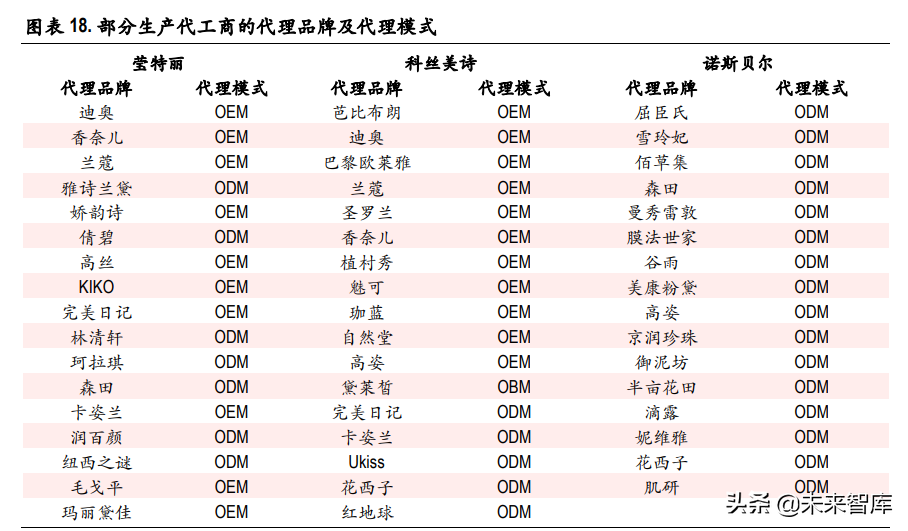 代工市场竞争格局较为分散,且以中小企业为主。2018 年,科丝美诗(中国)市场占有率高达 5.26% 的市场份额;本土龙头诺斯贝尔(青松股份子公司)的市场占有率为 3.65%,而其他中小型代工企业 占据了 90%以上的市场份额,整体行业集中度较低。