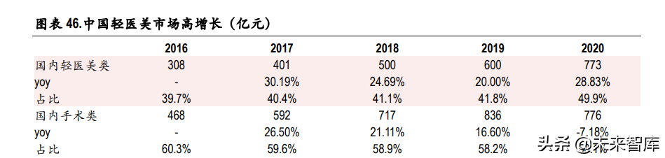 3)医美术后修复需求有望带动医美级产品市场潜力。中国医美市场终端规模自 2016 年 776 亿元增至 2019 年 1436 亿元,CAGR 为 22.8%,远高于规模增速(2016-2019 年规模 CAGR 为 9%),且 轻医美类增速更快,据 Frost & Sullivan 预测,2025 年轻医美终端消费总规模有望达到 1992 亿元,为 2020 年的 2.57 倍。而医美术后消费者仍需要有较专业、无添加和无刺激的护肤品对皮肤进行修复, 因此术后修复产品,即医用敷料(械字号)有望在未来医美市场高增下需求进一步被激发。