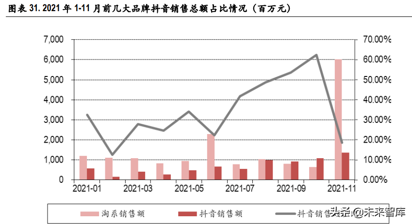 新兴电商快速放量,线上流量处于去中心化进程中。据星图数据,2021 双十一期间综合电商中天猫、 京东、拼多多、其他平台销售额占比 57%、33%、4%、7%,天猫份额同比-2.6pct。此外,抖音、快手 等直播电商快速放量。我们选其几大品牌,包括 whoo 后,雅诗兰黛,雪花秀,欧诗漫,花西子,珀 莱雅,韩束,加总其抖音销售额计算抖音销售额占抖音及淘系平台销售额比重发现,21 年以来整体 的抖音平台销售占比呈现波动向上趋势。