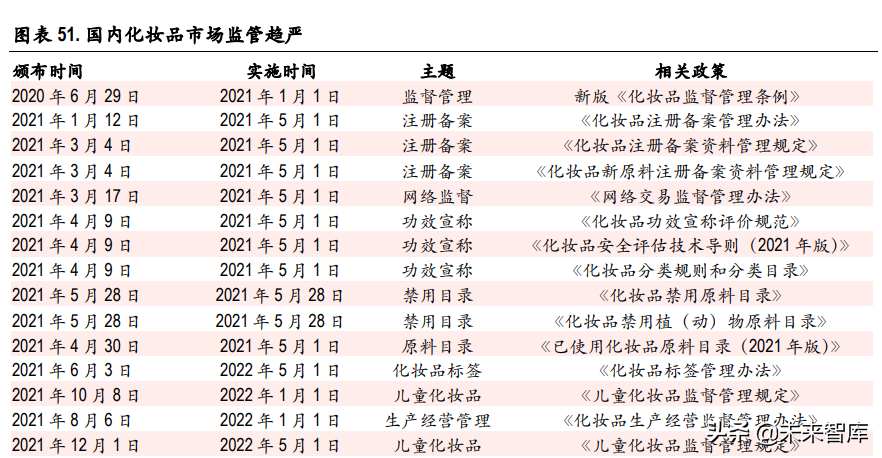 2020 年-2021 年,化妆品行业监管政策不断加强。2020 年 6 月 29 日,国务院发布了《化妆品监督管 理条例》,是行业发展 30 年来基本法规的修订。2021 年开始逐步颁布了《化妆品注册备案 管理办法》、《化妆品生产经营监督管理办法》、《化妆品功宣称评价规范》等法规。政策强监 管领域涉及从上游原料供应、生产经营、注册备案、再到销售等层面,也预示着 2022 年往后化妆品 行业进入强监管时代。