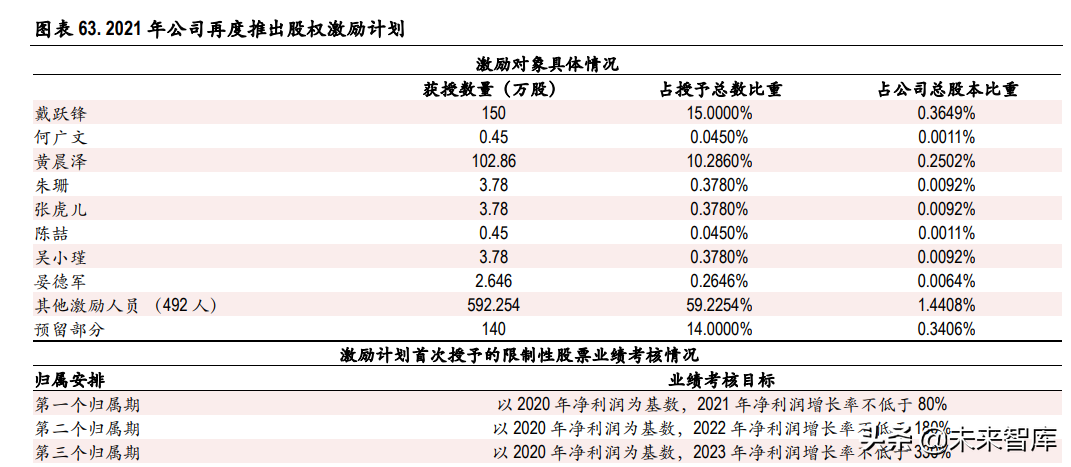 2019 年后,随着公司线下渠道拓展,收入快速增长,2020 年收入占比达 9.89%。公司线上渠道主要包 括淘宝、天猫在内的“淘系”平台以及唯品会、京东、蘑菇街、聚美优品等电商平台,其中,“淘系”平 台为公司大的销售平台,2020 年收入占比达 52.18%。;线下渠道主要有屈臣氏、沃尔玛、家乐福、 万宁、各大城市化妆品专营店和公司自营店等。当前,公司成长于“淘系”平台,积极拓展抖音等新 兴线上营销渠道,同时深入布局线下端,实现全渠道运营。 管理体系,股权激励高度激发员工积极性:为进一步提升团队凝聚力、激发员工活力,公司继 2019 年 5 月公司推出股票期权与限制性股票激励计划后,再度于 2021 年 3 月推出股权激励计划,激励对 象涉及公司董事和高管等人,其中除公司总经理戴跃锋先生外,任御泥坊品牌事业部总经理黄晨泽授予 比例较大,也可见公司对御泥坊主品牌的重视。激励计划的实施将公司核心团队与公司利益深度绑定, 有利于充分调动员工的积极性和创造性,促进公司良性发展。 核心优势:强品牌运营能力+代运营品牌资源丰富。