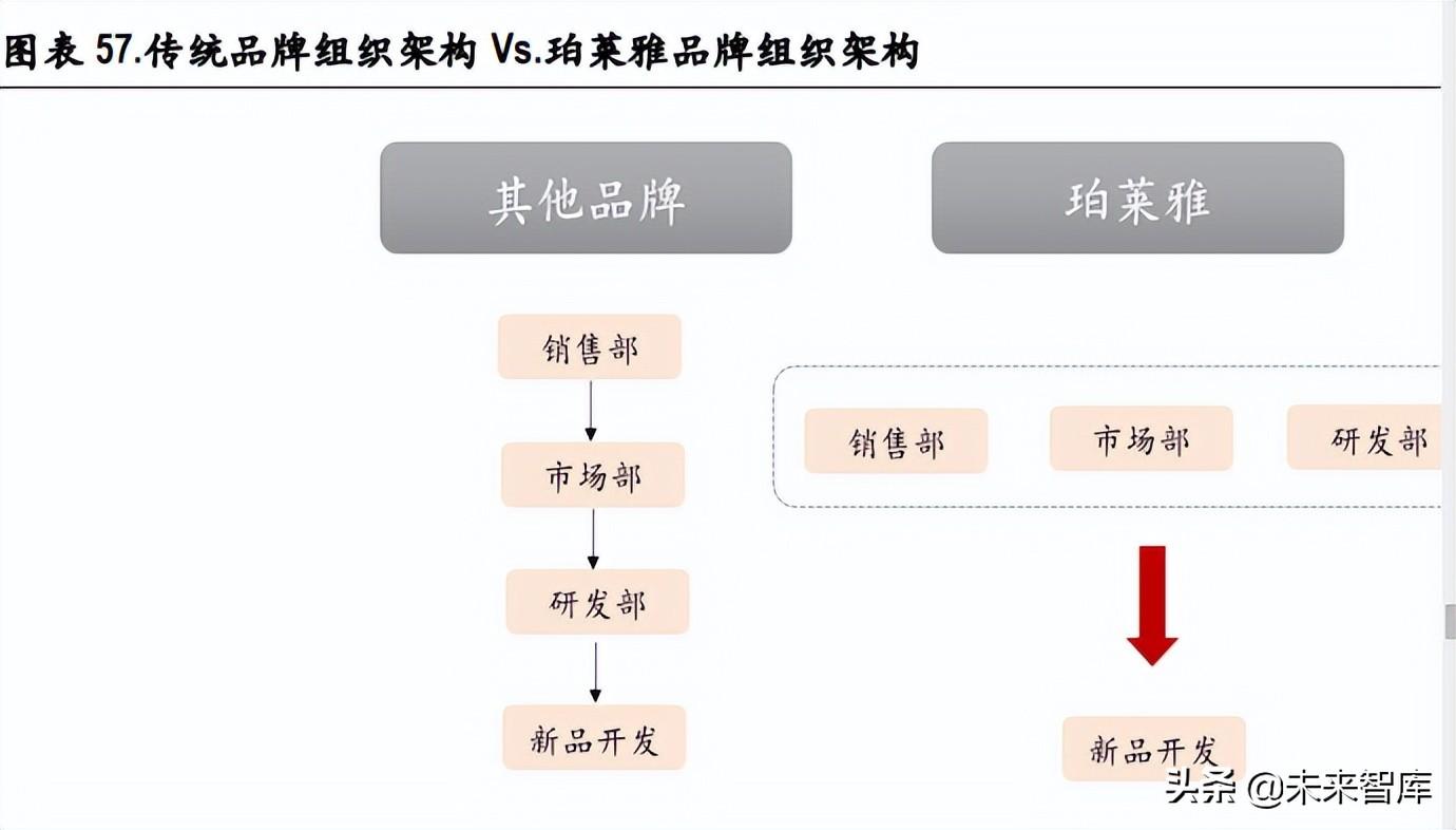 渠道布局:2016 年以前,依托 CS 渠道的不断下沉实现了快速拓展;17 年开始及时把握线上渠道红 利,快速布局;近两年传统电商持续发力,同时在新兴电商上,加大投入,把握新一轮红利。 组织架构与管理体系:公司提倡打造一个互联网公司的组织架构,即由过往的层层管理,改变成为 网状架构。以新品开发为例,主要采用多部门并联式,即各个部门均参与对产品的洞察和开发中, 多角度挖掘并高吸纳消费者需求,实现产品的快速推新。此外,公司倡导“高投入、高绩、高 回报”的绩文化,建立“定目标、 盯过程、拿结果”的绩管理体系;围绕业务战略,全力构建 短(季度绩、项目激励)、中(年度超额分红)、长期(股权激励、合伙人)的多元化业务激励体系。 核心优势:对渠道模式变化的及时把控+对核心消费群体心理及需求的挖掘。(报告来源:未来智库)