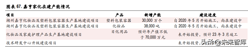 器的设计、制造的一体化综合服务。公司的主要客户包括强生、贝泰妮、多特瑞、维多利亚的秘密 以及三谷等,涉及的产品包括强生婴儿润肤露、洗发露、爽身粉、可伶可俐洁面乳、邦迪消毒液、 薇诺娜系列产品等。在新客户开发方面,公司 2020 年与宝洁、联合利华、贝亲等多家知名品牌建立 了合作,有利于分化大客户经营风险给公司带来的不利影响,为公司后续营收增长奠定坚实基础。 客户销售收入占比方面,公司第一大客户 2020 年收入占比达 29.73%,前五大客户收入总占比达 73.66%。 产能布局与规划:公司采用订单式生产模式,截至 2020 年,公司已有化妆品产能 21000 吨/年,家庭 护理产品产能 25,000 吨/年,塑料包装容器产能 87,000 万个。截至目前公司三个项目的产能利用率分 别为 97.00%/74.00%/80.00%,处于较饱和状态。2020 年公司规划产能中,有塑料包装容器和化妆品两 个产能项目处于在建状态。