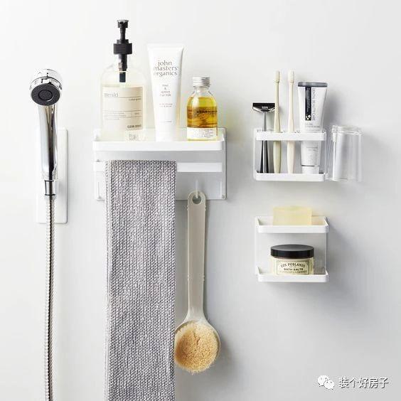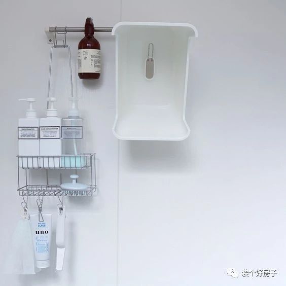淋浴区也主要靠悬挂,比如在花洒附近安置上置物架,放沐浴产品。