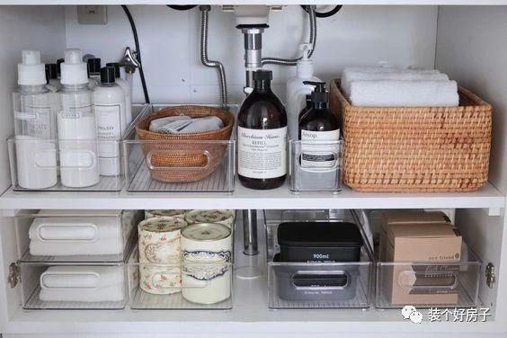 水池下大家爱的收纳地方。不占用空间,还能隐藏起很多杂物。我们需要借助一些收纳工具,这样会更整洁。伸缩杆是必备,可以悬挂很多清洁剂、抹布之类的物品。统一收纳盒,也是整洁度的表现之一。