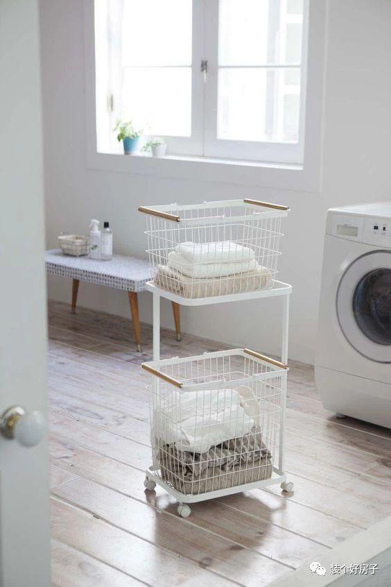 洗衣机周边有空间的话,需要有个放脏衣服或者准备晾晒的衣服。这种带有滑轮的、双层的衣篮很受大家欢迎。