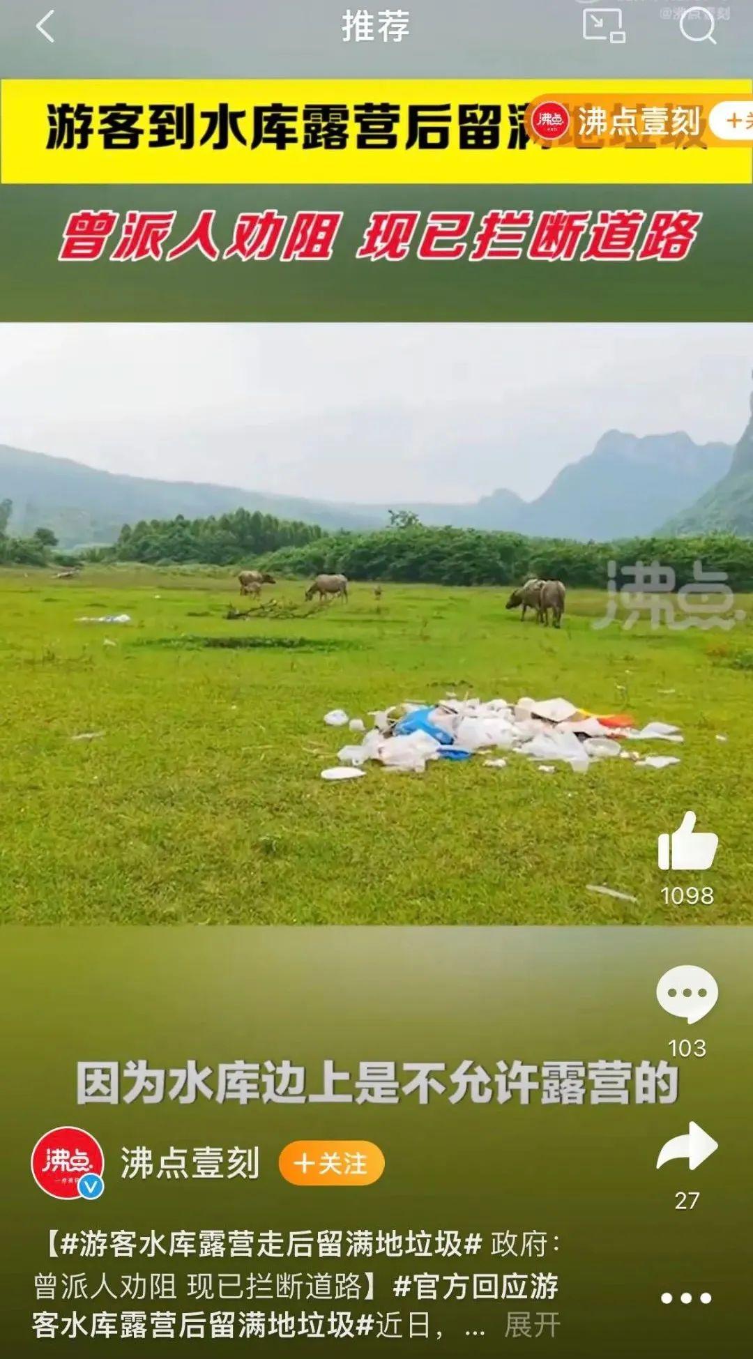 广西柳州麒麟水库,原本山清水秀、风景旖旎,被评为露营圣地,然而五一假期的露营热之后,麒麟水库周边的草地到处扔着易拉罐、塑料包装等垃圾,地皮被火烧得坑坑洼洼,甚至连牛都找不到一块好点儿的地方安心吃草,惹得饲养员一脸哀愁,有苦难言。