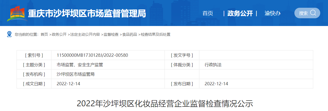 中国质量新闻网讯 2022年12月14日,重庆市沙坪坝区市场监管局网站公示2022年沙坪坝区化妆品经营企业监督检查情况。具体情况如下: