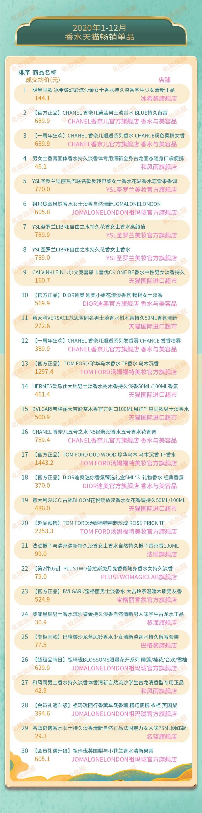 在一众外资品牌中,国产香水品牌冰希黎的表现格外亮眼。在TOP20香水品牌中,冰希黎排名第九。在天猫畅销单品TOP30榜单中,冰希黎幻彩流沙金女士香水位列第一。依据天猫香水V榜,该香水近一年来的销量与搜索量在同品类中都位居No.1。这款曾被认为“一夜爆红”的爆款香水,在2020年依旧保持着其流量光环。