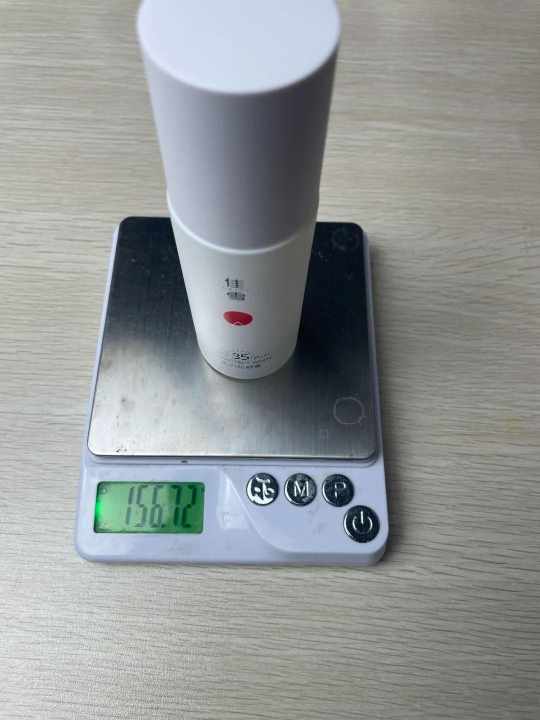 这次测评的防晒霜,大部分都是塑料包装,其中佳X是玻璃瓶装,里面的防晒霜才40g,总重量却有156g。看起来小小一瓶,放在小手提包里很重。
