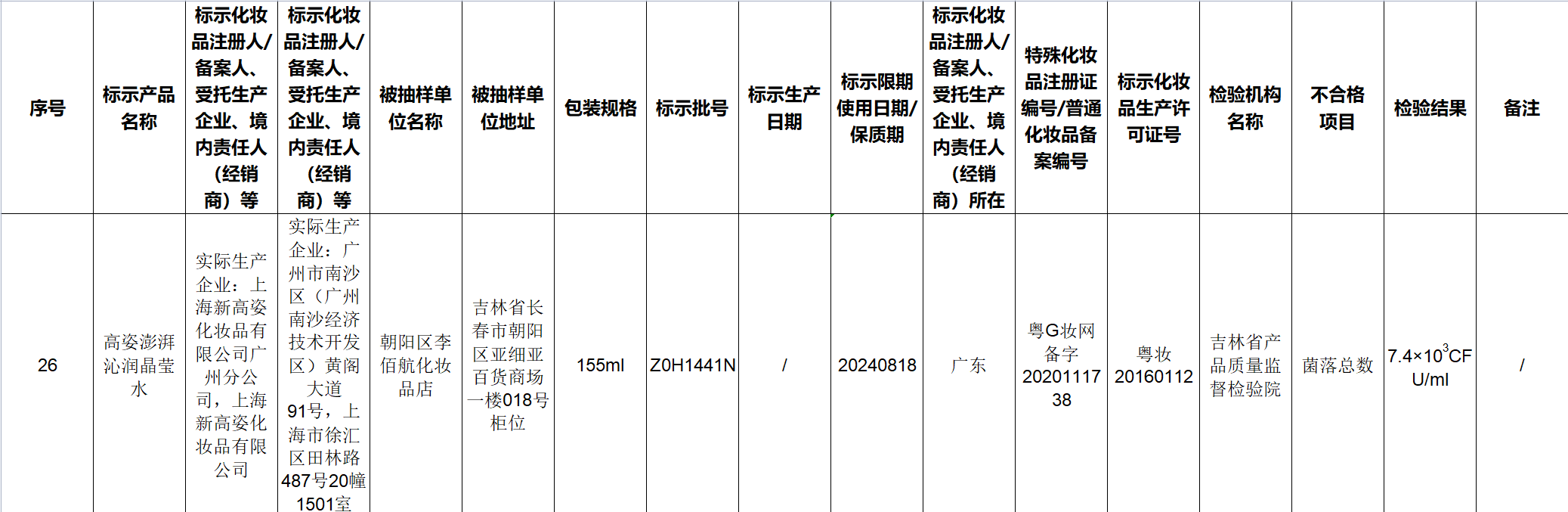 公告显示,一批次标示产品名称为“高姿澎湃沁润晶莹水”,标示实际生产企业为上海新高姿化妆品有限公司广州分公司、上海新高姿化妆品有限公司,标示批号为Z0H1441N的产品被抽检出菌落总数超标,检验结果为7.4×103CFU/ml。