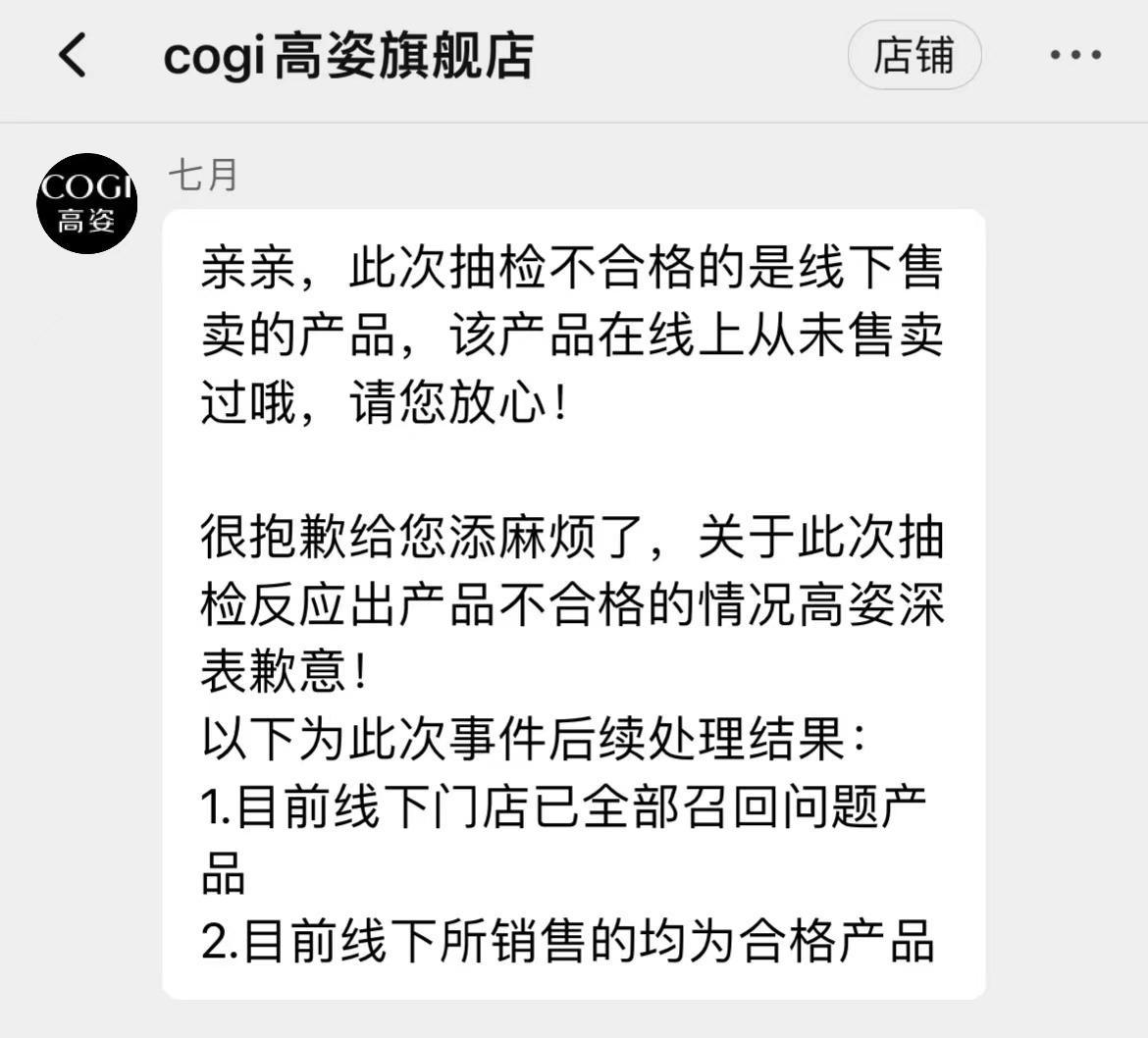 11月16日,高姿旗舰店客服回应,“很抱歉给您添麻烦了,关于此次抽检产品不合格的情况高姿深表歉意!”并表示此次抽检不合格的是线下售卖的产品,该产品在线上从未售卖过。此外,目前线下门店已全部召回问题产品,且线下所销售的均为合格产品。