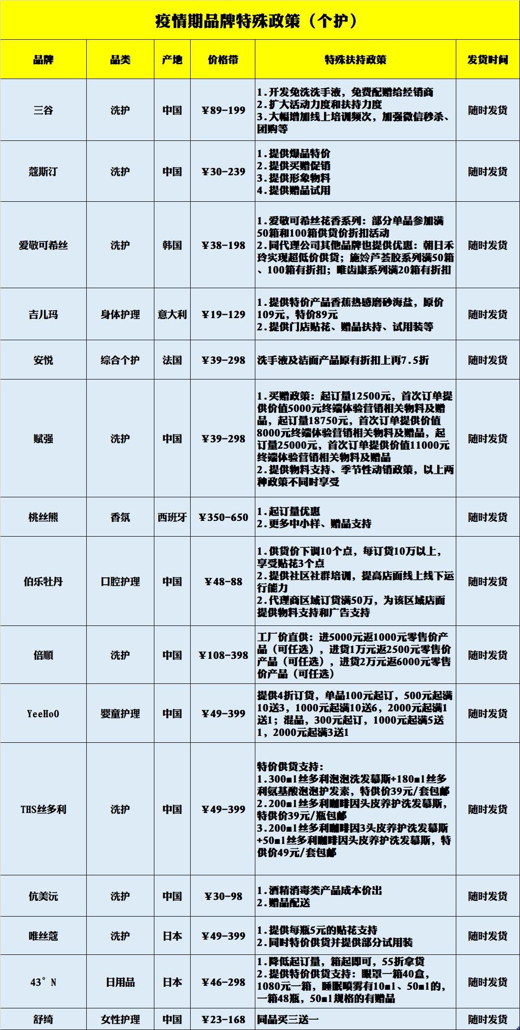定位天然植物洗护品牌的唯丝蔻,经日本专家团队十年研发,致力于探寻大自然中解决头皮或头发问题的佳的植物组合,并用科学的对策综合不同植物的功,研发出解决不同头皮或头发问题的经典配方。针对疫情,可以给予每瓶5元的贴花支持,同时提供特价供货政策以及部分试用装。