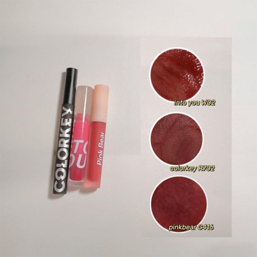 colorkey、intoyou、pinkbear:这三支颜色有点相似,都是浓郁的红棕色,适合秋冬季节涂,colorkey是那种水光果冻感,更加偏纯欲风格,ntoyou显色度偏低,更加日常,pinkbear成膜后是哑光的,更有质感一些。