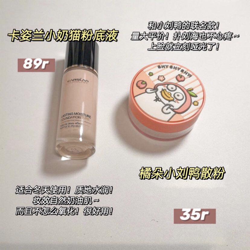 橘朵小刘鸭散粉:可可爱爱的散粉,粉质相比来说没那么细,但控油还不错,能持妆三四个小时~