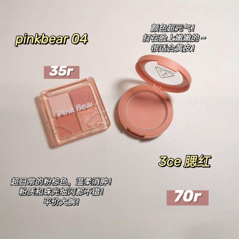 pinkbear眼影盘:这盘玫瑰蜜桃色太仙甜了,搭配起来就是那种初恋感的清纯眼妆,什么场合都hold住,土豆泥质地软糯糯的,用手晕都能搞定眼妆!