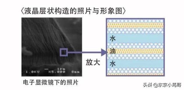 1969年,弗里伯格(Friberg)第一次发现在油相和水相混合的膏体中加入表面活性剂时,析出了第三相——液晶相,液晶结构又叫微乳状液,是由:水份、油脂、液晶(表活剂和助表活剂)形成的分散液滴,直径只有10纳米~100纳米。