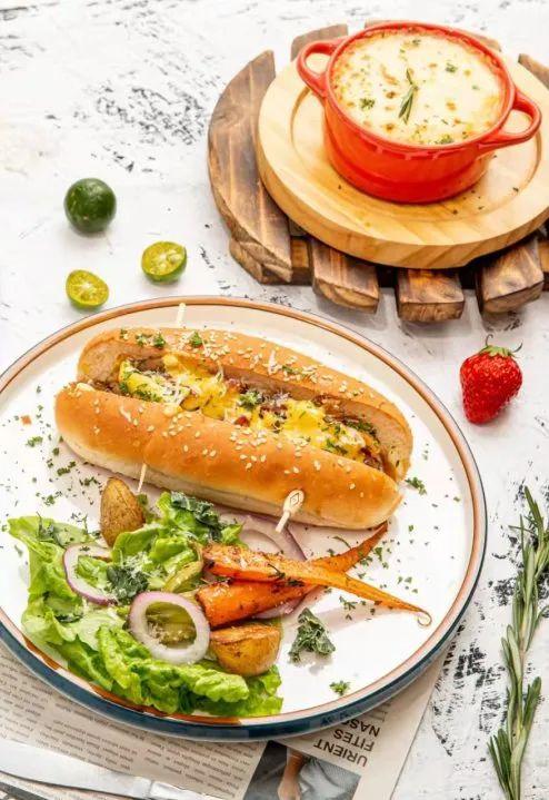 坐在店里的落地玻璃旁,迎着春日的阳光,也太适合拍照了。店里主打的西餐,风味烤鸡、波普红惠灵顿、高温火烧美式厚牛排口味和颜值双双满分。