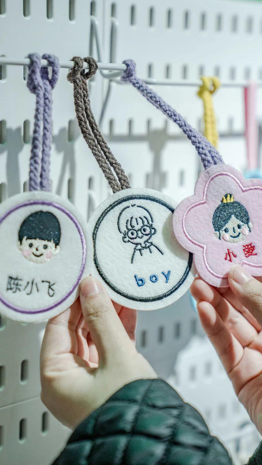 可爱的娃娃头造型,是提前用机器定制上去的,选好和自己宝宝相同的样子,然后制作属于宝宝名字的就可以啦。挂在书包上,相当可爱了。