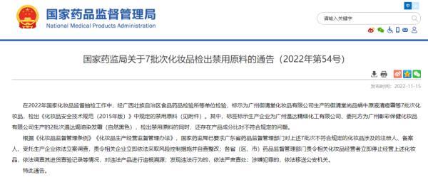 关于7批次化妆品检出禁用原料的通告