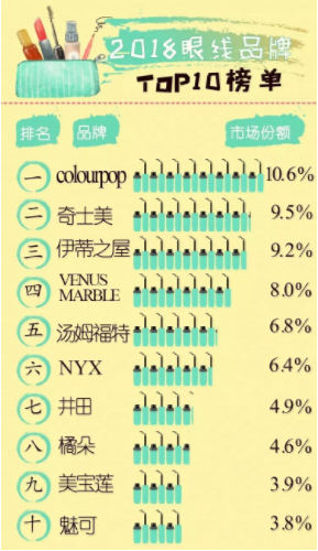 在2018年的眼线线上销售热榜上,“卡拉泡泡”、奇士美和伊蒂之屋三个品牌几乎不相上下,占据整个线上眼线市场份额近三分之一。通过这一系列的榜单也不难看出,消费者在选择粉底、口红、蜜粉等对妆感服帖度、整体质感呈现影响关键的底妆产品时更偏好国际,而在挑选眼影、眉笔、眼线等更强调色彩、时尚感的彩妆品类时,则更易受到当前流行趋势、品牌的影响。