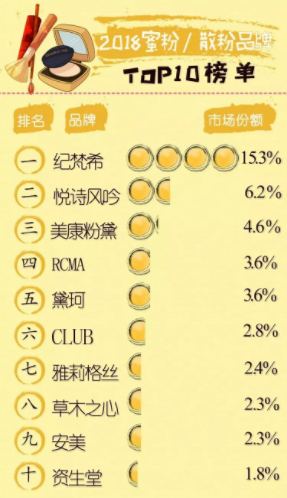 粉底作为女性底妆的重中之重,入围的基本全部是进口品牌,雅诗兰黛单独占据10%的市场份额,其销售量高的便是DW粉底液和沁水粉底液,今年天猫“双十一”预售截至目前为止,也已累计预订破13万瓶。