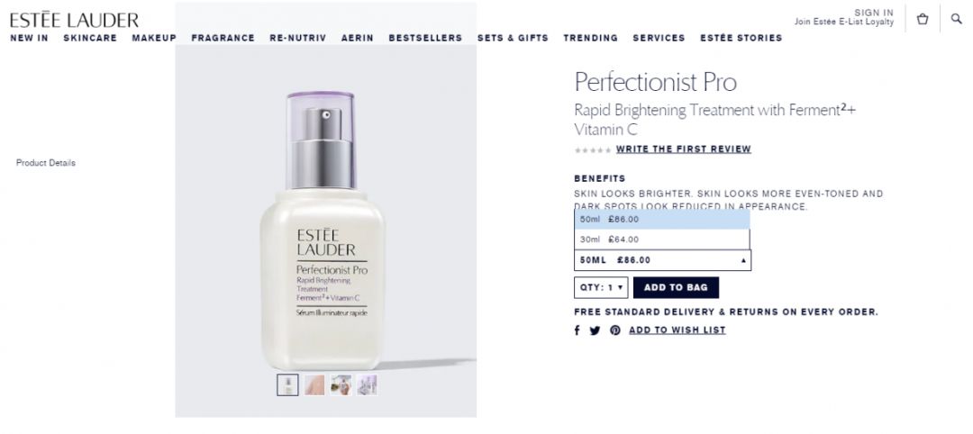 “Perfectionist Pro”以下是Estee Lauder中国官网、英国官网、法国官网的价格对比