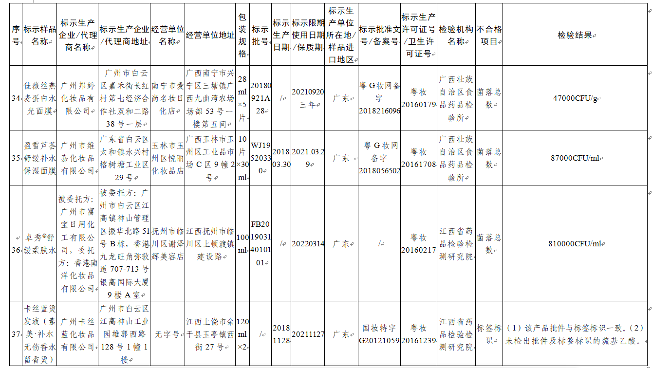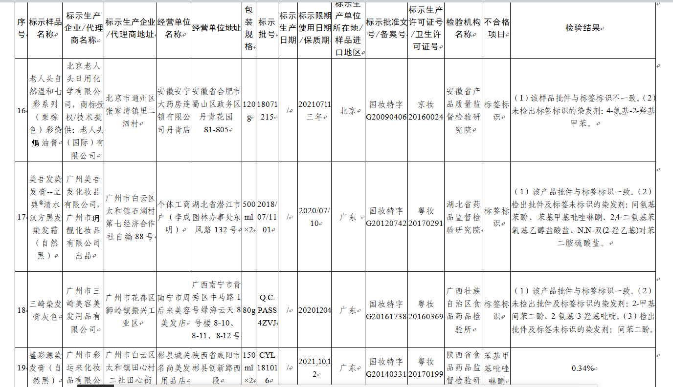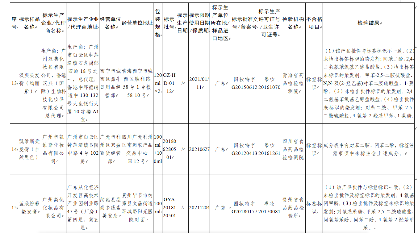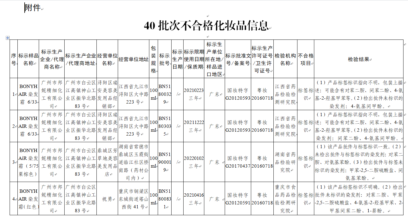 近日,药监总局发布通告:经江西省药品检验检测研究院等单位检验,标示为广州市邦妮精细化工有限公司等18家企业生产的BONYHAIR染发霜 6/33等29批次染发类化妆品,广州市品优生物科技有限公司等4家企业生产的简涵?莹润调理保湿面膜等6批次面膜类化妆品,广州市富宝日用化工有限公司生产的卓秀?舒缓柔肤水1批次护肤产品,广州卡丝蓝化妆品有限公司等2家企业生产的卡丝蓝烫发液(素美·补水无伤香水留香烫)等4批次烫发类产品不合格。