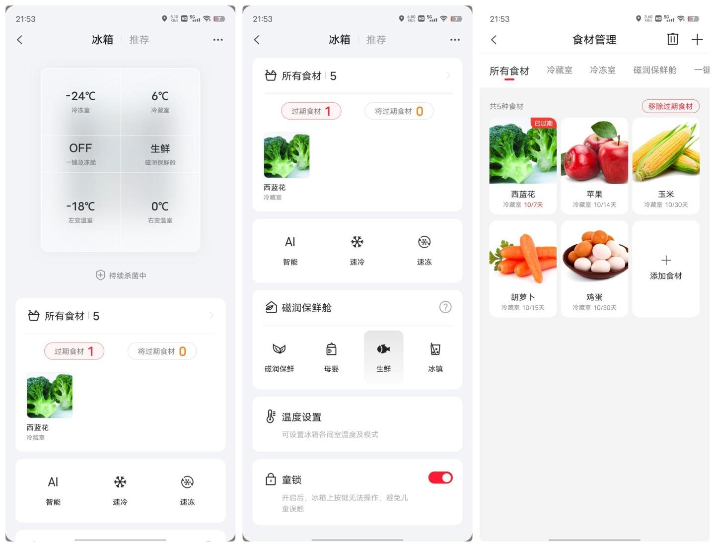在 App 内,能够实时显示冰箱每个舱的工作状态,还可以远程控制温度,以及添加食材,食材过期还会有相应的提醒,甚至还集成了产品的说明书、保修卡等模块。