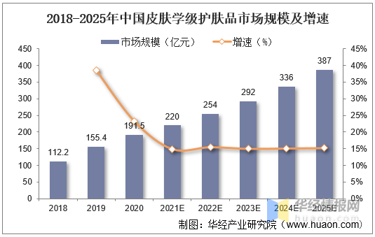 从皮肤学级护肤品市场来看,2020年我国皮肤学级护肤品市场规模为191.5亿元,同比增长23.23%,增速约为国内护肤品市场整体增速2倍,预计2025年市场规模约为387亿元。