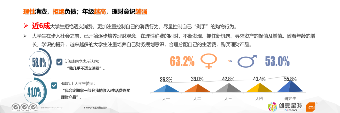 ●调研显示,近6成的大学生拒绝透支消费,他们更加注重控制自己的消费欲望,杜绝自己“剁手”的购物行为。女学生比男学生更加认同理性消费,拒绝负债。