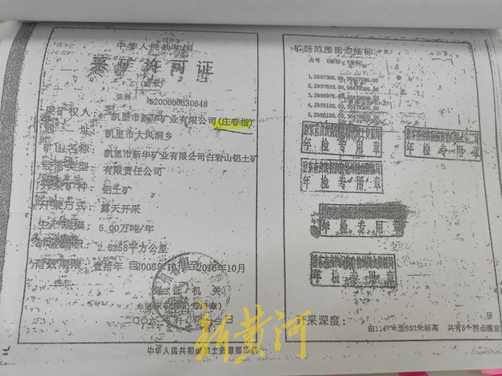 日前,新黄河记者来到贵州省黔东南凯里市,在村民带领下来到凯里市新华矿业有限公司原址。记者看到,现场杂草丛生,房屋破烂不堪,已无开采痕迹,现场的采矿权标识碑上明确,“贵州省凯里市新华矿业有限公司白岩山铝土矿;采矿权人:凯里市新华矿业有限公司(庄春楷);有期限:二〇〇六年十月至二〇一六年十月”等信息。