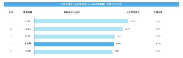 根据弗若斯特沙利文报告,中国的化妆品市场较为分散,按零售额计,前五大参与者占21.9%的市场份额,全属国际化妆品集团。公司于2021年的零售额为人民币75.56亿元,国内化妆品市场的市场份额为1.7%,于中国国货化妆品市场排名第四。在国货品牌护肤品市场排名第三,零售额为人民币64.47亿元;在国货面膜产品市场中位列榜首,零售额为人民币18.42亿元;在国货品牌母婴护理品市场中亦居首,零售额为人民币17.89亿元。