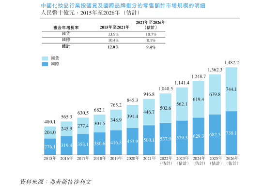 受惠于中国电商平台的发展,化妆品的零售额通过在线渠道在中国快速增长,根据弗若斯特沙利文报告的数据,2015年至2021年的复合年增长率为23.5%,2021年中国从在线渠道产生的化妆品总零售额将达到人民币4,763亿元,超越线下渠道,预计于2026年将达到人民币6,033亿元。