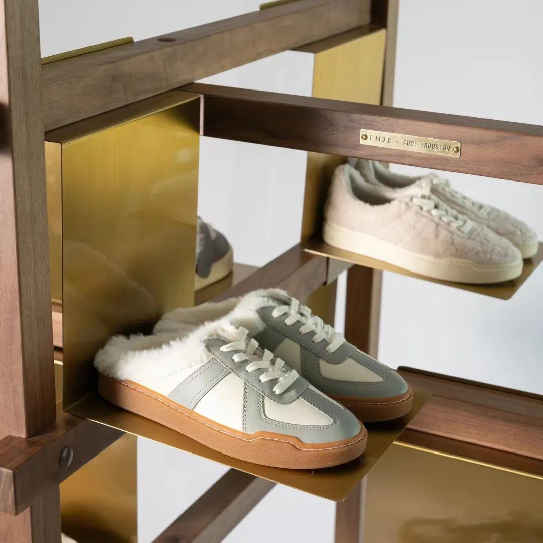 梵几传承中国传统工艺,通过木工匠人的亲手打磨,保留木材原生纹理与质感。以梵几的代表性材质黑胡桃木及榫卯结构为基础特别设计的鞋履展示架做出了全新的场景化呈现。合作款艺术相框也为家中的收藏鞋款提供展示空间。兼具了舒适与质感的限定款家居鞋,将休闲气质带入居家。