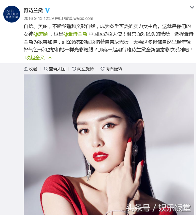 杨幂的闺蜜好友唐嫣,同样也和雅诗兰黛有关系,