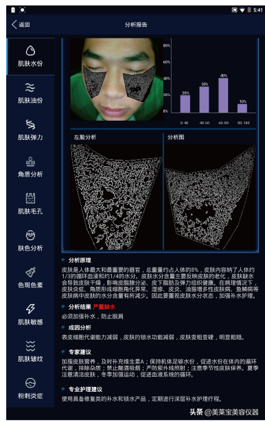 强大的分析功能:根据皮肤状况和肌肤年龄,针对个体差异提供细致的分析报告,建立和生成调节护理方案,推荐合适的护肤产品。