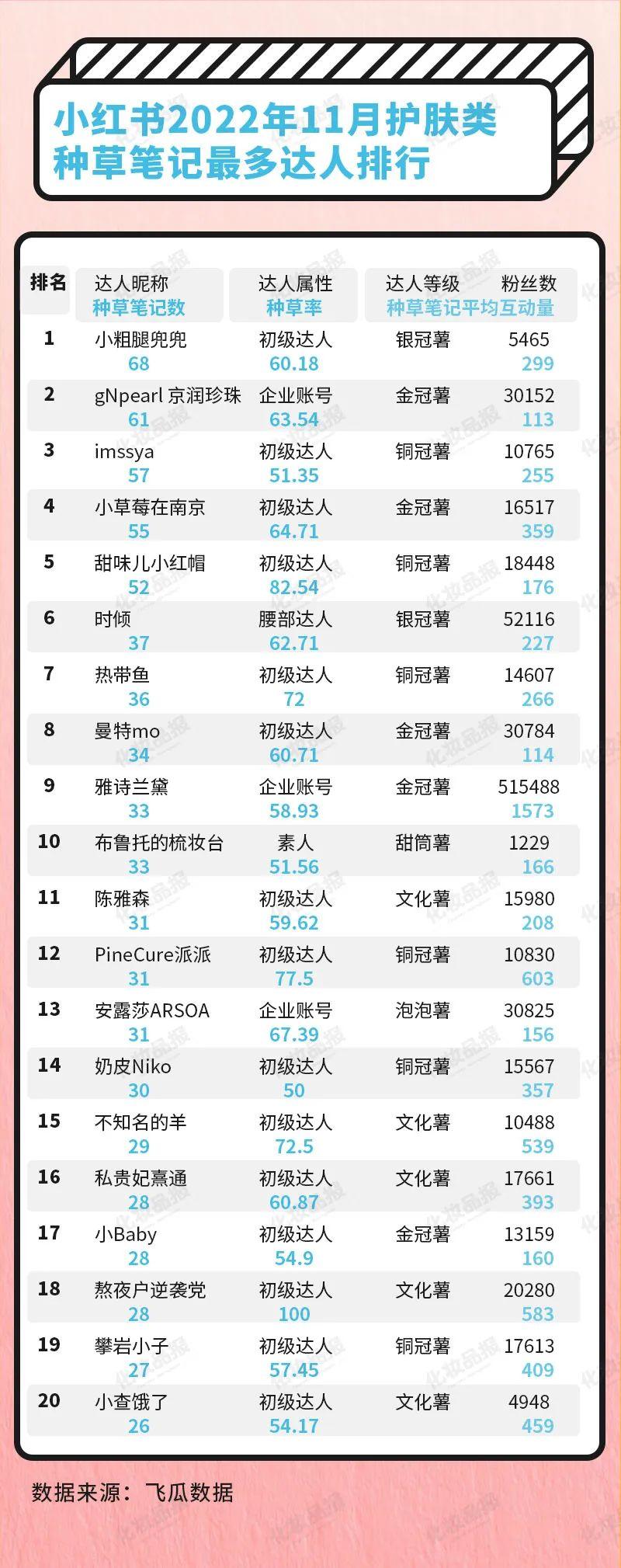 在种草笔记方面,达人小粗腿兜兜、gNpearl 京润珍珠、imssya、小草莓在南京以及甜味儿小红帽,成功上榜小红书2022年11月护肤类种草笔记多达人榜单top5,其中,排行第二的gNpearl 京润珍珠为企业账号,其余四位皆是个人账号。