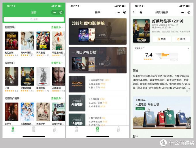 使用感受:如果你是一个只看评分的豆瓣非重度用户,“豆瓣评分”小程序是你好的选择。这个小程序抽取了豆瓣上的影视类内容,做成了一个可快速查询影视评分的小工具。首页有电影、电视剧、综艺三个影视分类,每个分类下方,都显示了当前热门的作品。