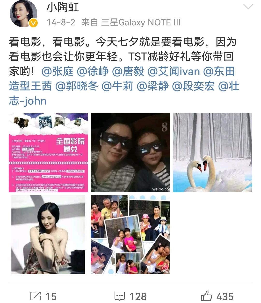 张庭的闺蜜,演员陶虹与TST绑定更深。天眼查显示,陶虹在上海达尔威持股1.93%,位列第七位股东。此外,陶虹持股的北京陶然服装服饰有限公司,是达尔威第五大股东。在陶虹微博中,也有不少关于TST宣传推广的信息。