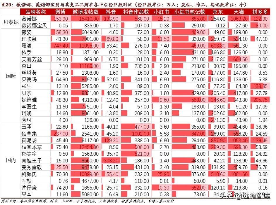 核心品牌薇诺娜在各大平台粉丝数处于前列。我们选取薇诺娜、薇诺娜宝贝的竞品品牌,在微博、抖音、小红书这类推广品台的粉丝数及发帖数均处于前列,同时在京东、天猫、拼多多等主要购买平台的粉丝数也处于前列。