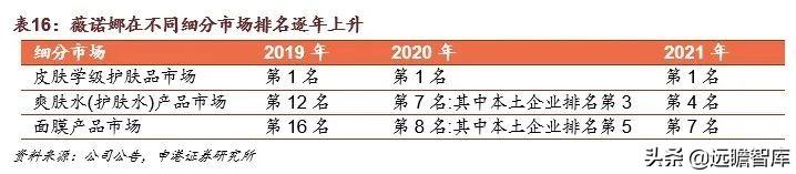 2021年,薇诺娜品牌头部应显著。根据Euromonitor统计数据,2021年公司旗下“薇诺娜”品牌在皮肤学级护肤品国内市场排名稳居第一,市场份额较2020年度提升约2个百分点。相较2020年度,“薇诺娜”品牌较第二、第三名的领先优势继续扩大,“薇诺娜”国内市场份额接近第二、三名的总和,头部应显著。另外,2021年公司爽肤水(护肤水)产品市场排名从第七上升至第四;面膜产品市场排名从第八上升至第七,公司在护肤品细分市场领域中持续表现出色。(报告来源:远瞻智库)