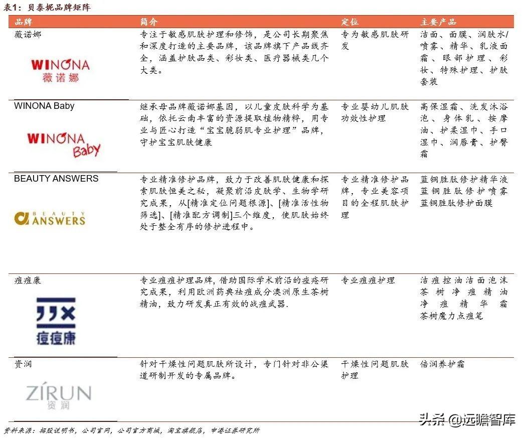 针对敏感肌护理的薇诺娜为贝泰妮旗下。贝泰妮旗下功性护肤品共有五大品牌,以定位于敏感肌护理修复的薇诺娜为主品牌,另有专业护理婴幼儿的WINONA Baby、针对专业美容项目的Beauty Answers、护理痘痘肌的痘痘康、针对干燥肌肤的资润。2022年即将上线一款针对高端抗衰的品牌AOXMED。
